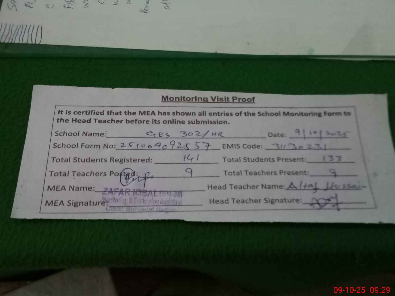 | Attendance Register | Head Teacher | MEA with School | Visit Proof |