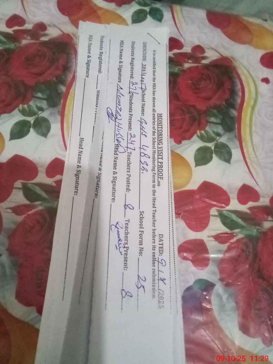 | Attendance Register | Head Teacher | MEA with School | Visit Proof |