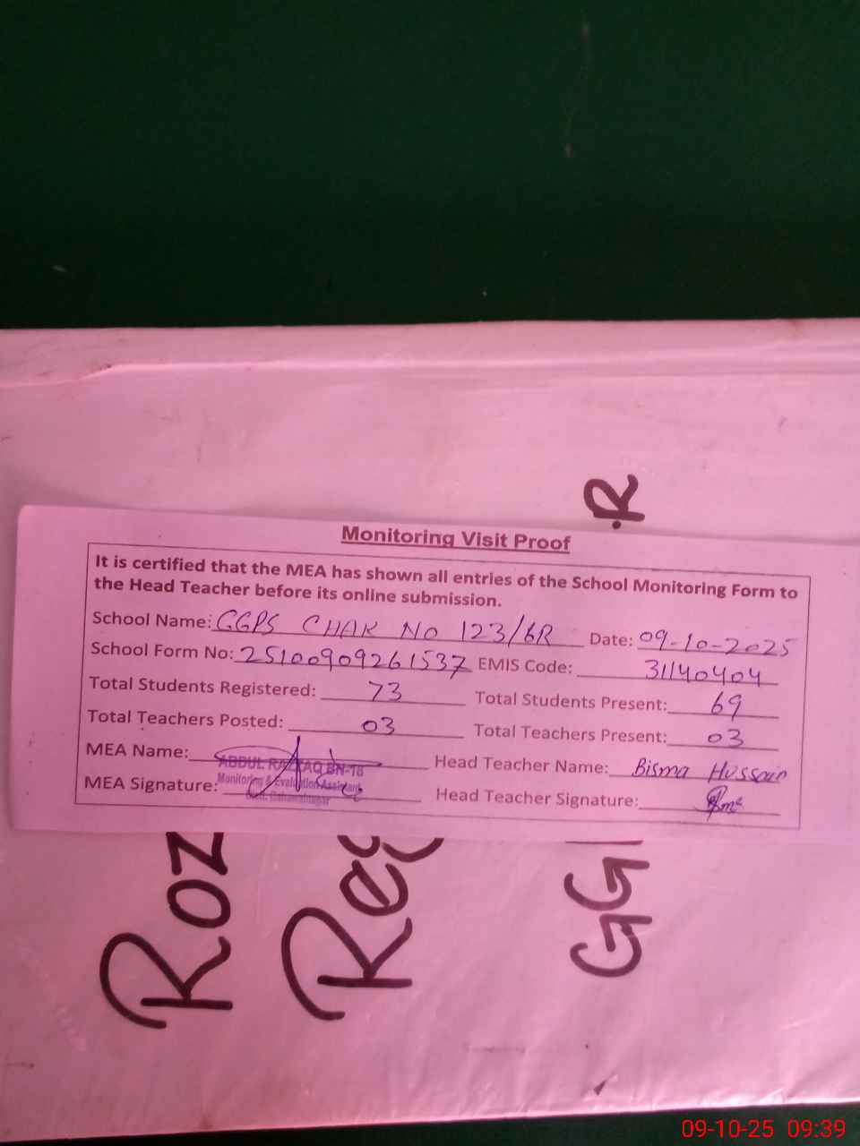 | Attendance Register | Head Teacher | MEA with School | Visit Proof |