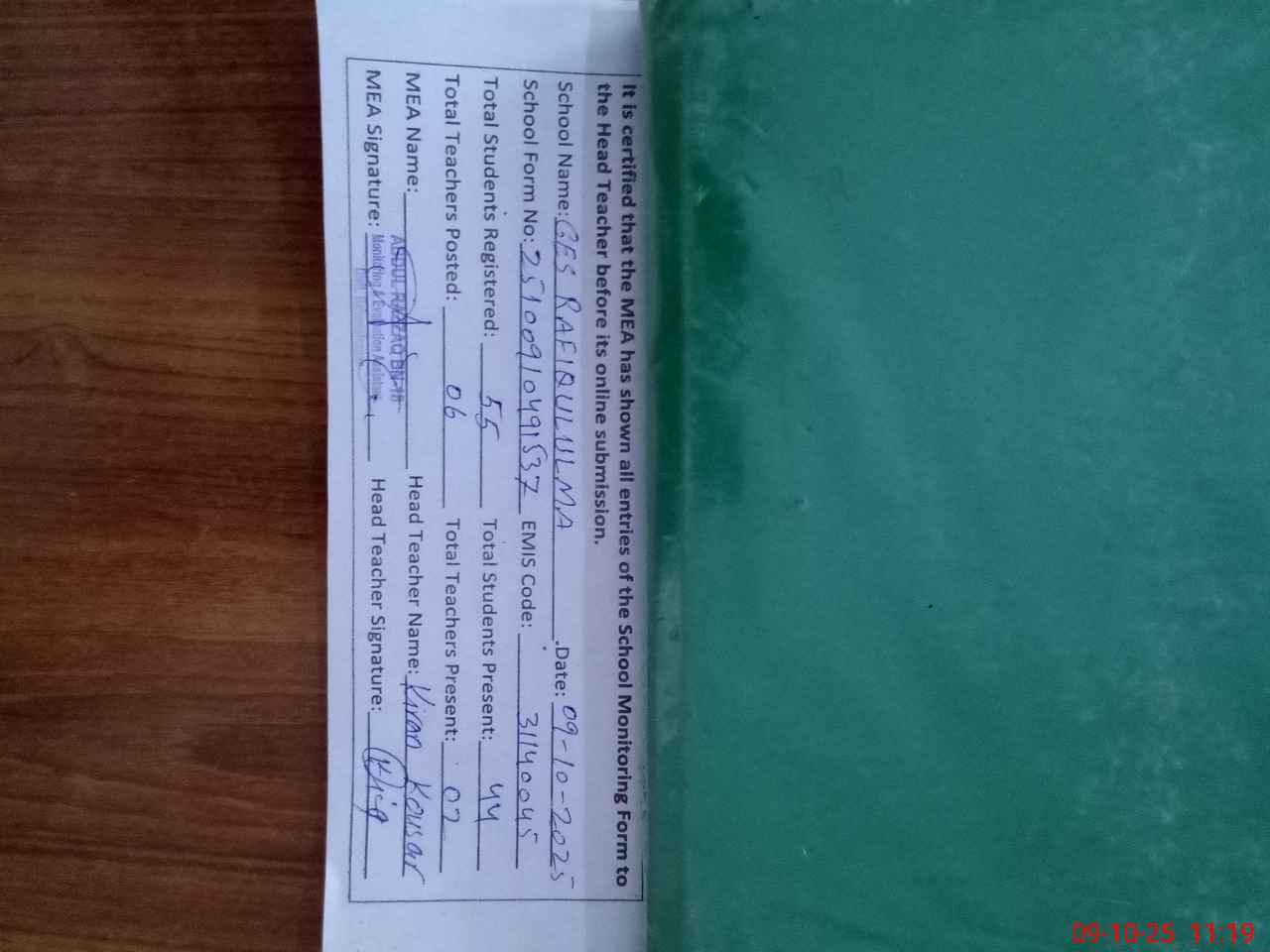 | Certified that this School was Inspected by the Undersigned MEA/DMO Today and the Information Stated Above is as Per Record. | |||||