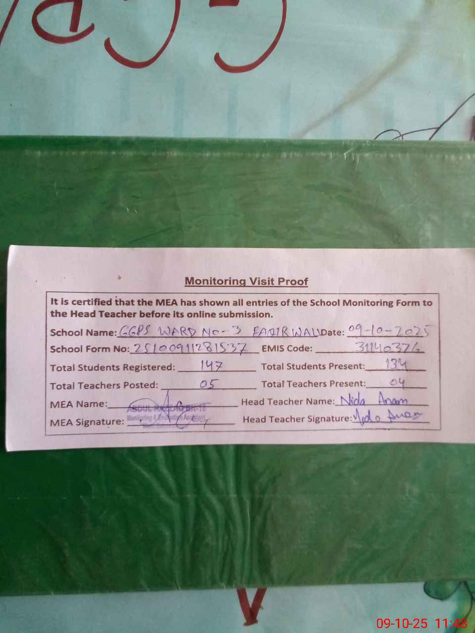 | Attendance Register | Head Teacher | MEA with School | Visit Proof |
