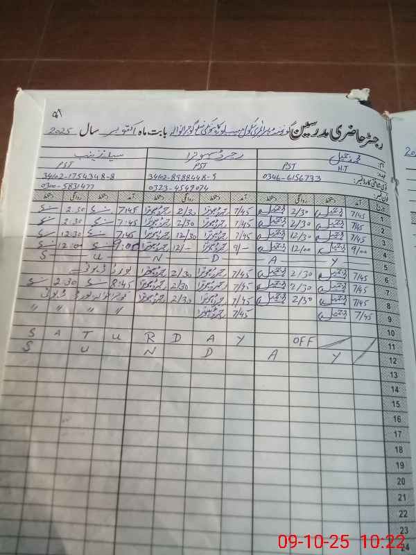 | 34**** | Sa**** Za**** | PST | Regular | 1 | 0 | 0 | 0 | 0 | 0 | 0 | 0 | 1 | Exam Duty |