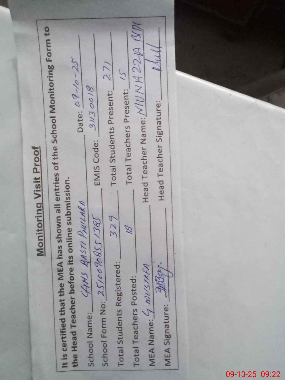 | Attendance Register | Head Teacher | MEA with School | Visit Proof |