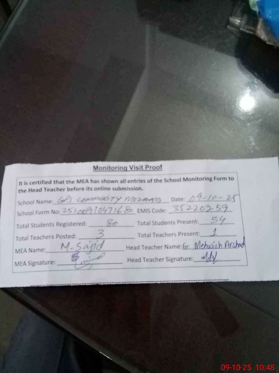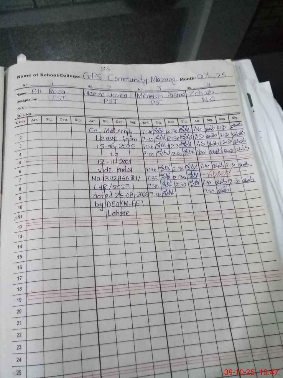 | Remarks (Use Separate Page if Required): School head PST Ali Raza was attached in DEO office for 89 days till 9 Sep 2025 but he did not come back in school so marked absent School has three teachers and another teacher is on maternity leave so school is being run with only one teacher presently No soap found at hand wash points School building has been declared dangerous and school is functional in GHSS school Mozang Adda Present students percentage is 68 percent 35220259 | |||||