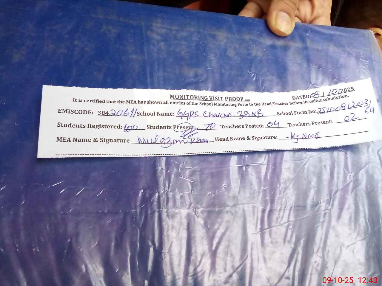 | Attendance Register | Head Teacher | MEA with School | Visit Proof |