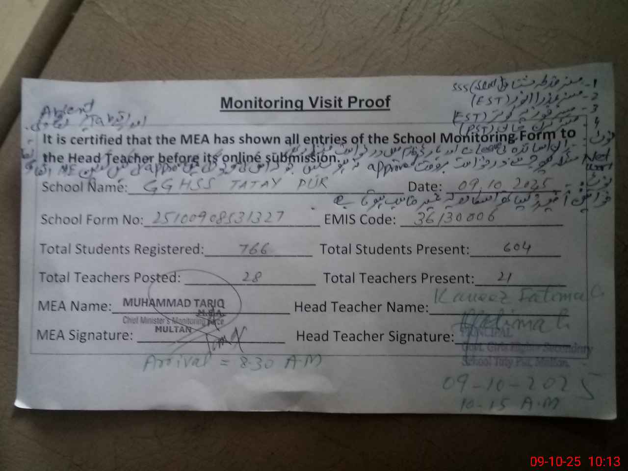 | Monitoring Date: 09-10-2025 | Start Time: 09-10-2025 08:53 AM | End Time: 09-10-2025 10:31 AM | Name of MEA: MU**** TA**** | |