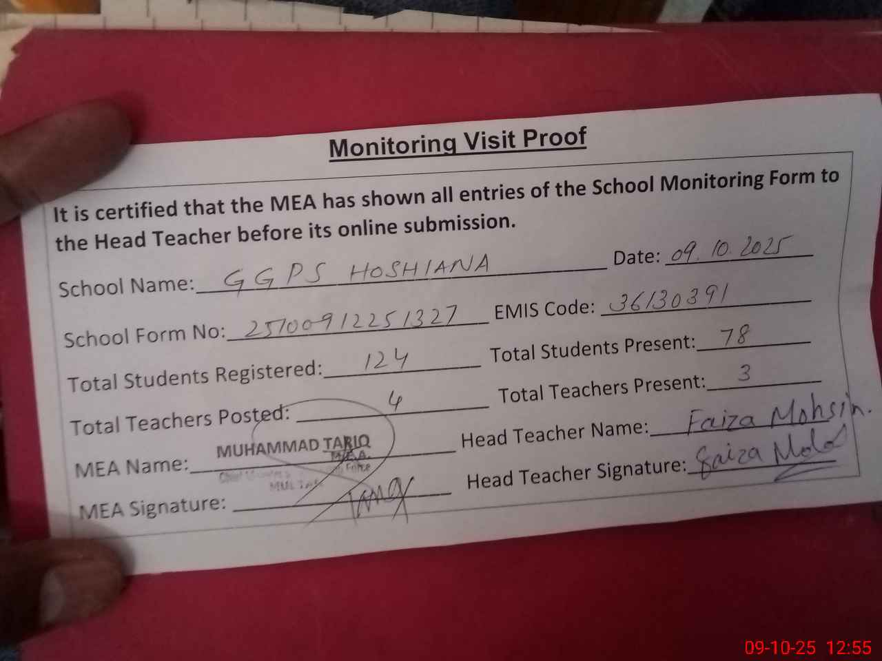 | Attendance Register | Head Teacher | MEA with School | Visit Proof |