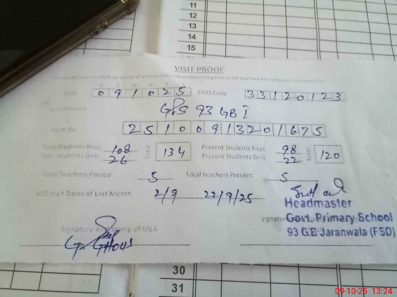 | Attendance Register | Head Teacher | MEA with School | Visit Proof |