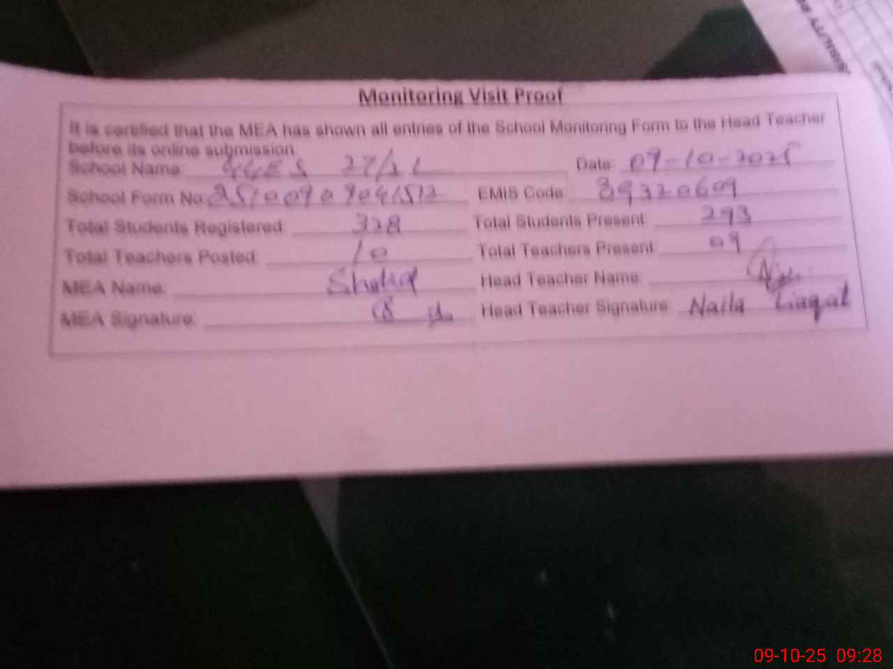 | Monitoring Date: 09-10-2025 | Start Time: 09-10-2025 09:04 AM | End Time: 09-10-2025 09:30 AM | Name of MEA: SH**** YO**** | |