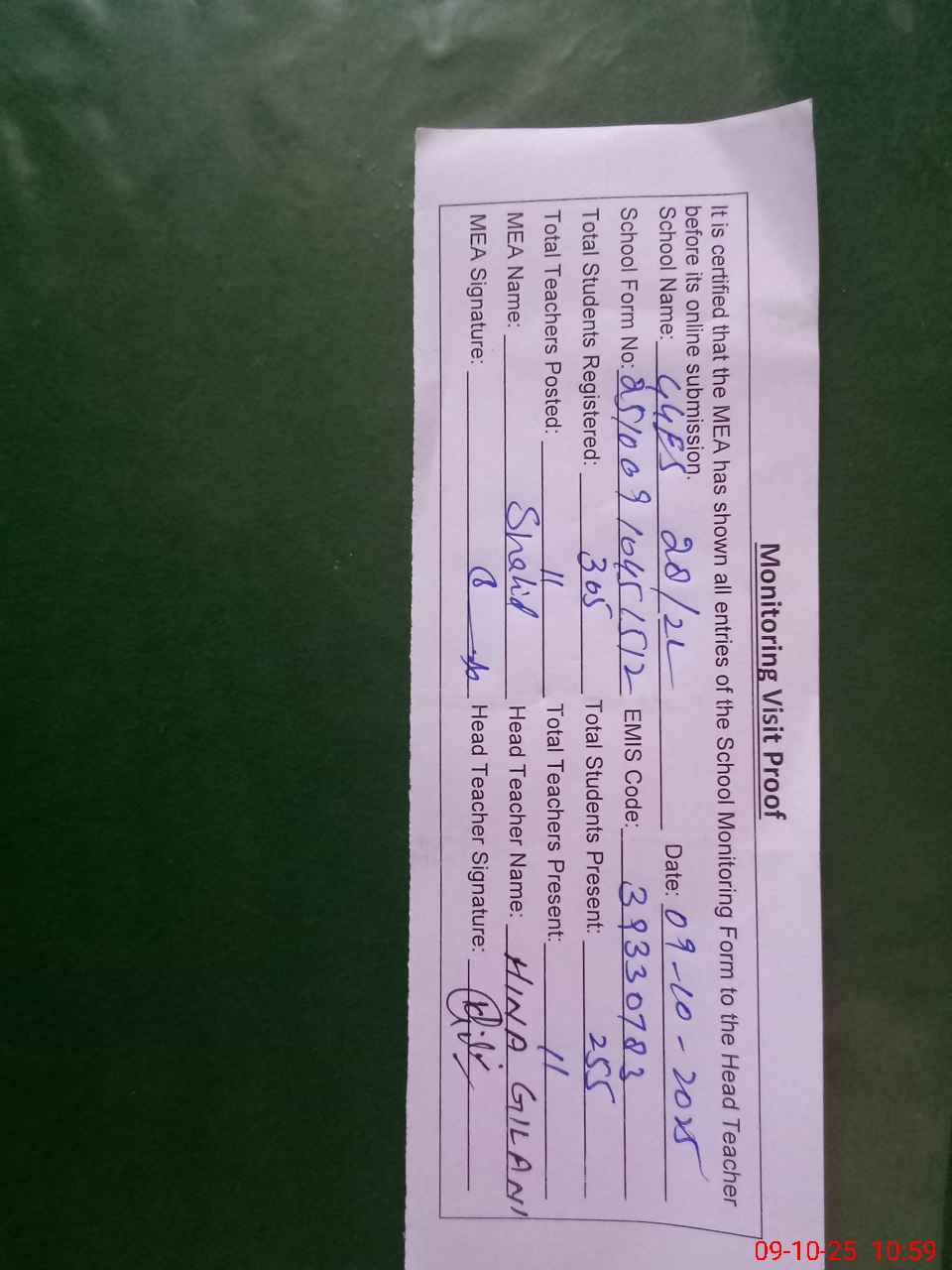 | Certified that this School was Inspected by the Undersigned MEA/DMO Today and the Information Stated Above is as Per Record. | |||||