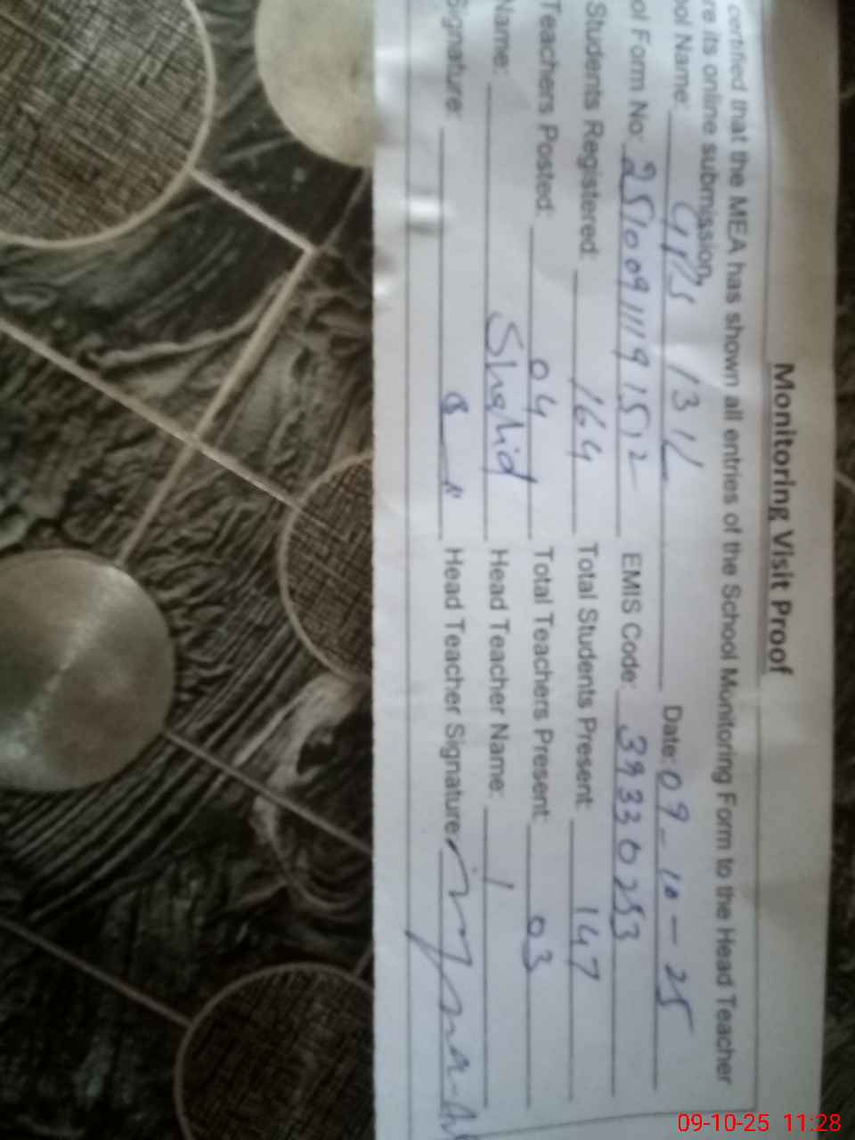| Attendance Register | Head Teacher | MEA with School | Visit Proof |