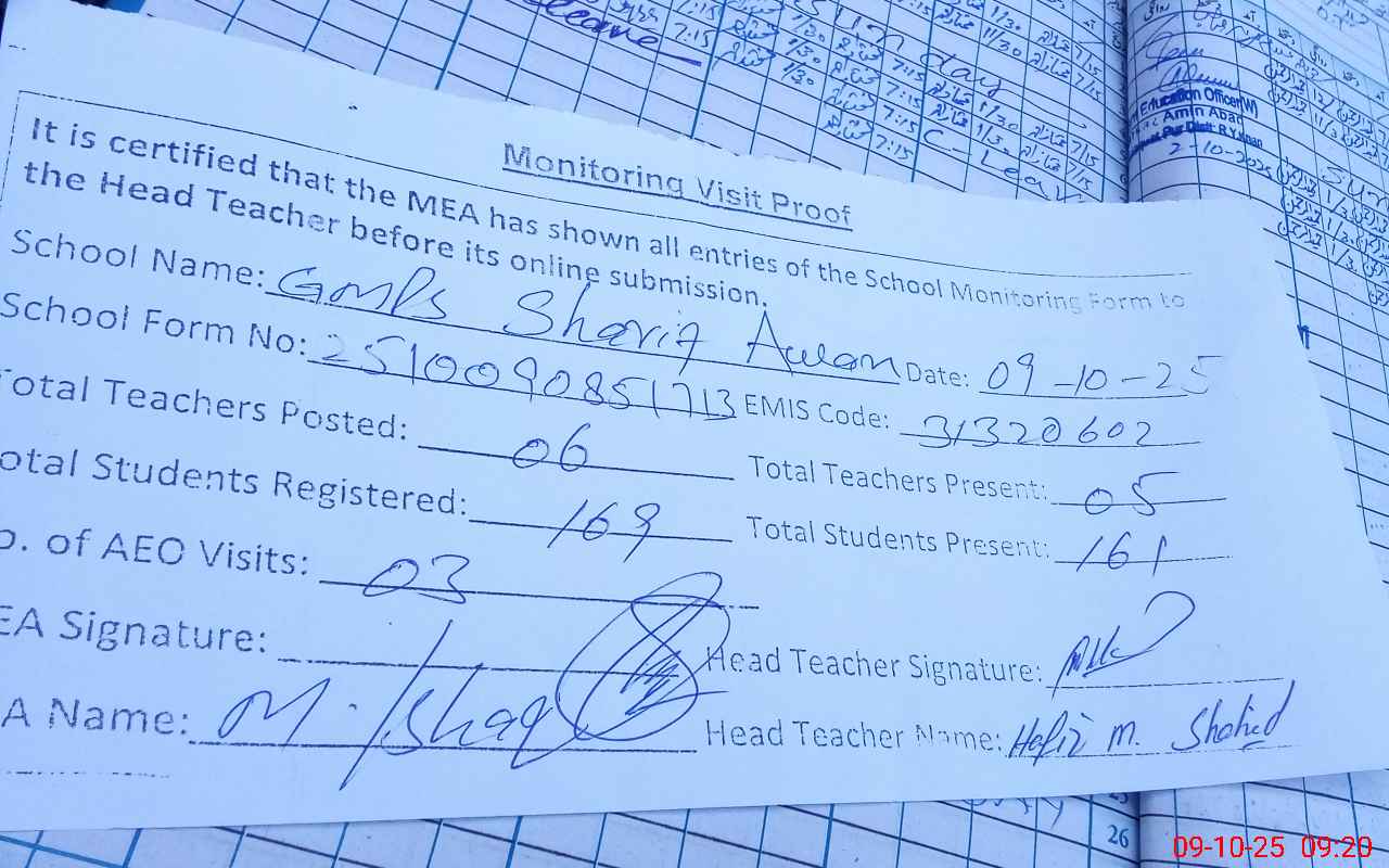 | Attendance Register | Head Teacher | MEA with School | Visit Proof |