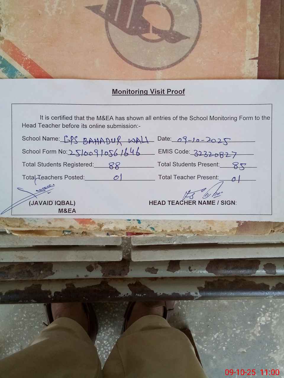 | Attendance Register | Head Teacher | MEA with School | Visit Proof |