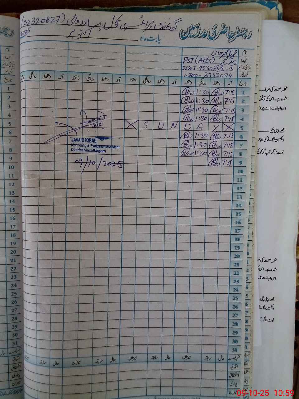 | Name: IR**** HU**** Designation: (School Headmaster's/Headmistress's) PST/PTC/JV Phone/Cell Number: 03**** |