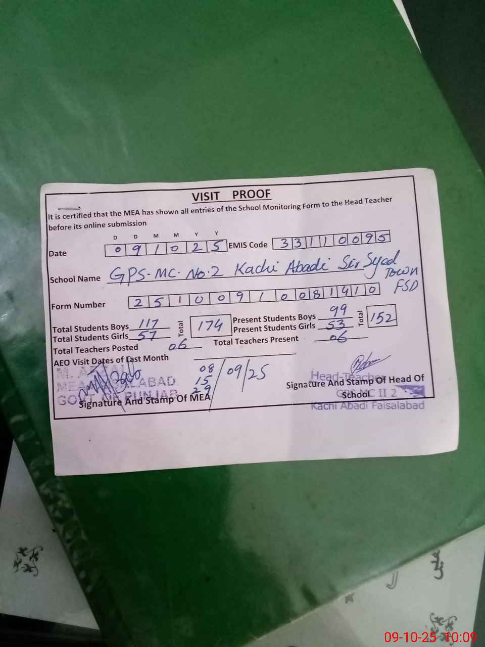 | EMIS Code: 33110095 | Name of School: GPS MC NO.2 KACHI ABADI FAISALABAD | |||