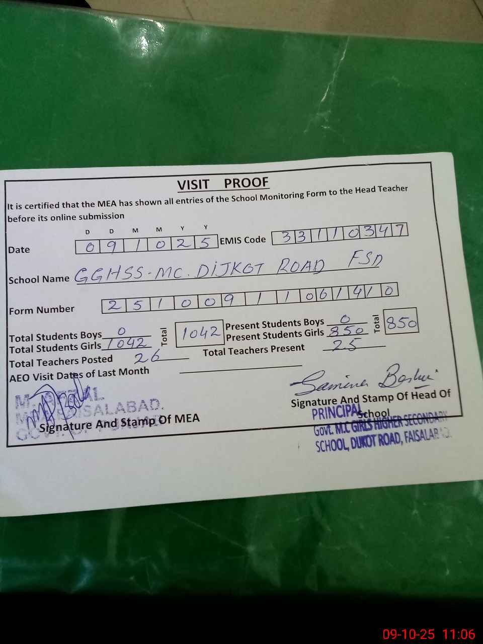 | Certified that this School was Inspected by the Undersigned MEA/DMO Today and the Information Stated Above is as Per Record. | |||||