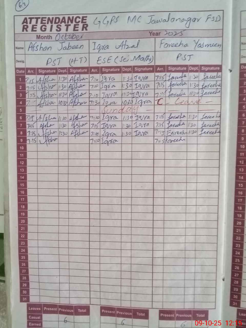 | CNIC | Full Name | Designation | R/C | Absence during last cal. month |