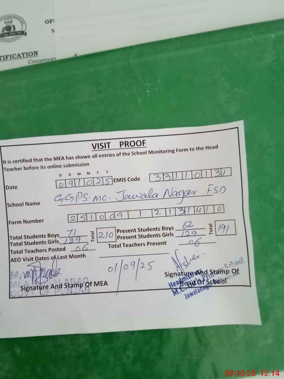 | Certified that this School was Inspected by the Undersigned MEA/DMO Today and the Information Stated Above is as Per Record. | |||||