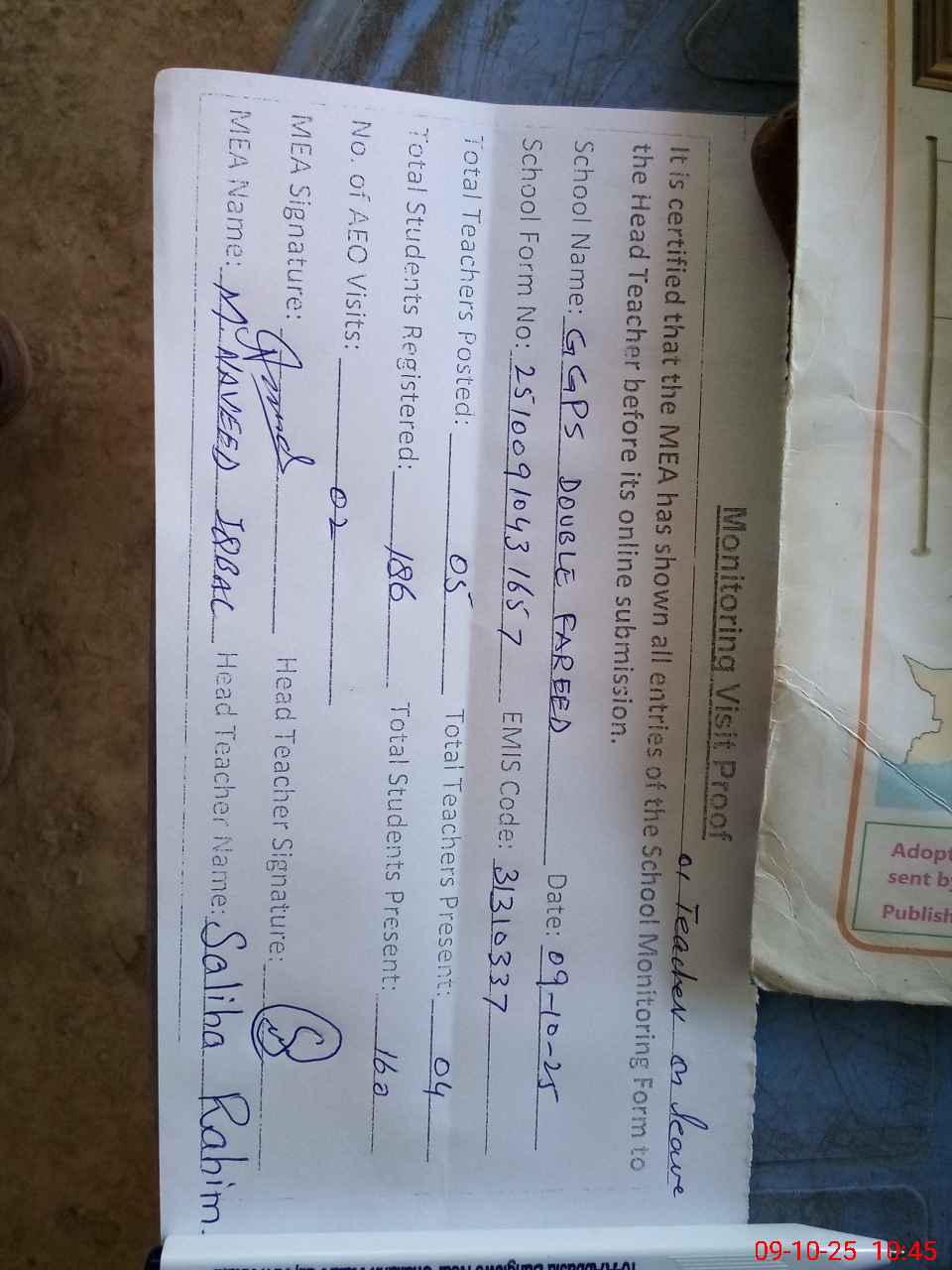 | Attendance Register | Head Teacher | MEA with School | Visit Proof |