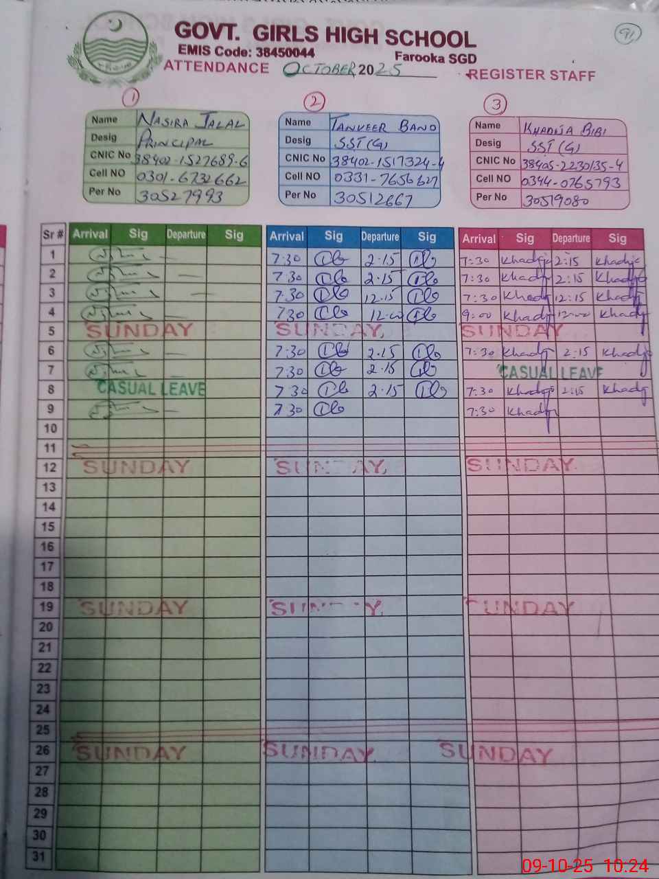 | CNIC | Full Name | Designation | R/C | Absence during last cal. month |