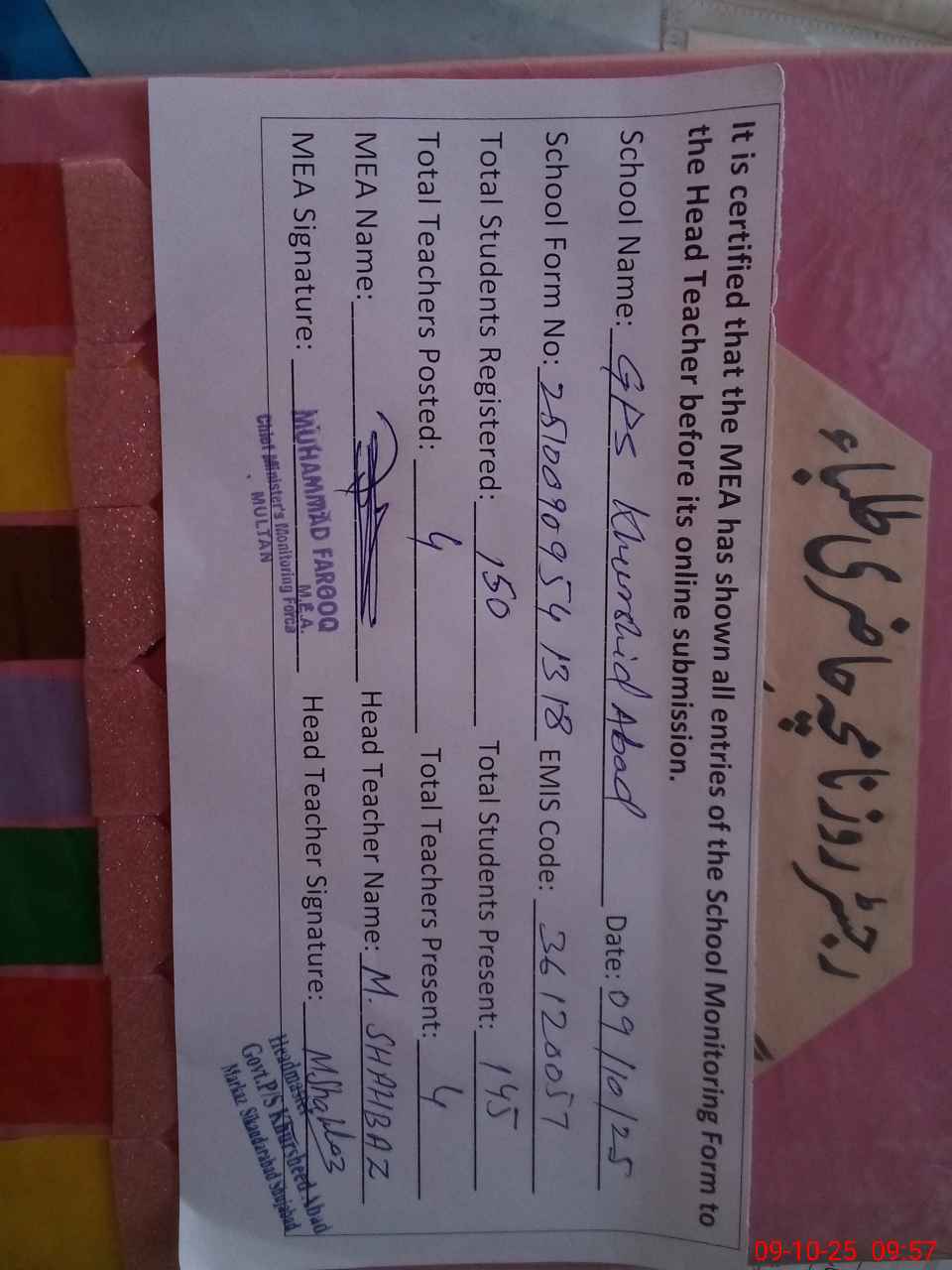 | EMIS Code: 36120057 | Name of School: GPS KHURSHID ABAD P/O SHUJABAD | |||