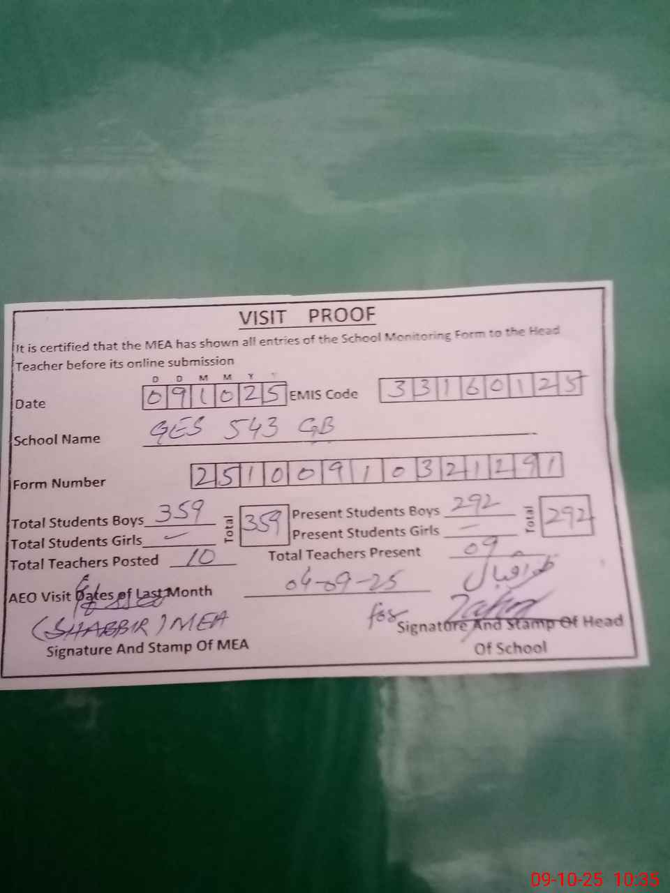 | Certified that this School was Inspected by the Undersigned MEA/DMO Today and the Information Stated Above is as Per Record. | |||||
