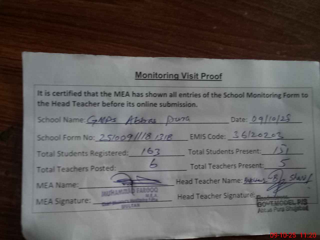 | Attendance Register | Head Teacher | MEA with School | Visit Proof |