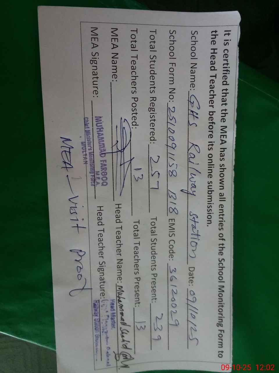 | Certified that this School was Inspected by the Undersigned MEA/DMO Today and the Information Stated Above is as Per Record. | |||||