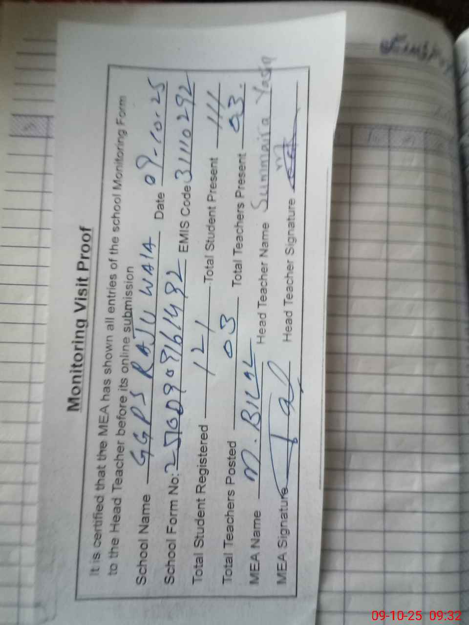 | Attendance Register | Head Teacher | MEA with School | Visit Proof |