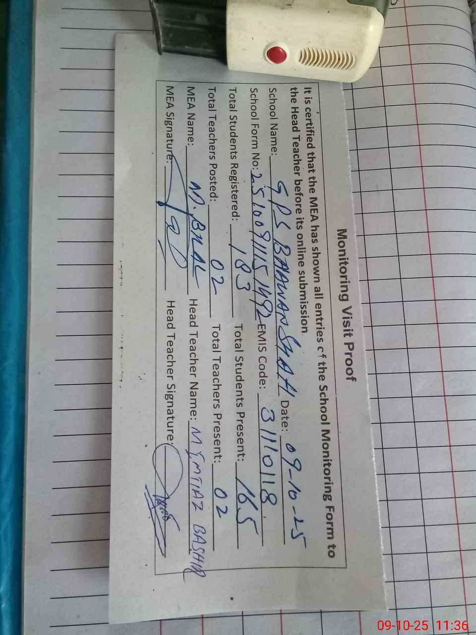 | Attendance Register | Head Teacher | MEA with School | Visit Proof |