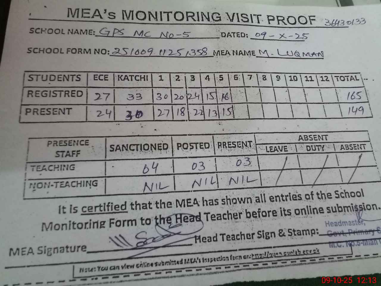 | Certified that this School was Inspected by the Undersigned MEA/DMO Today and the Information Stated Above is as Per Record. | |||||