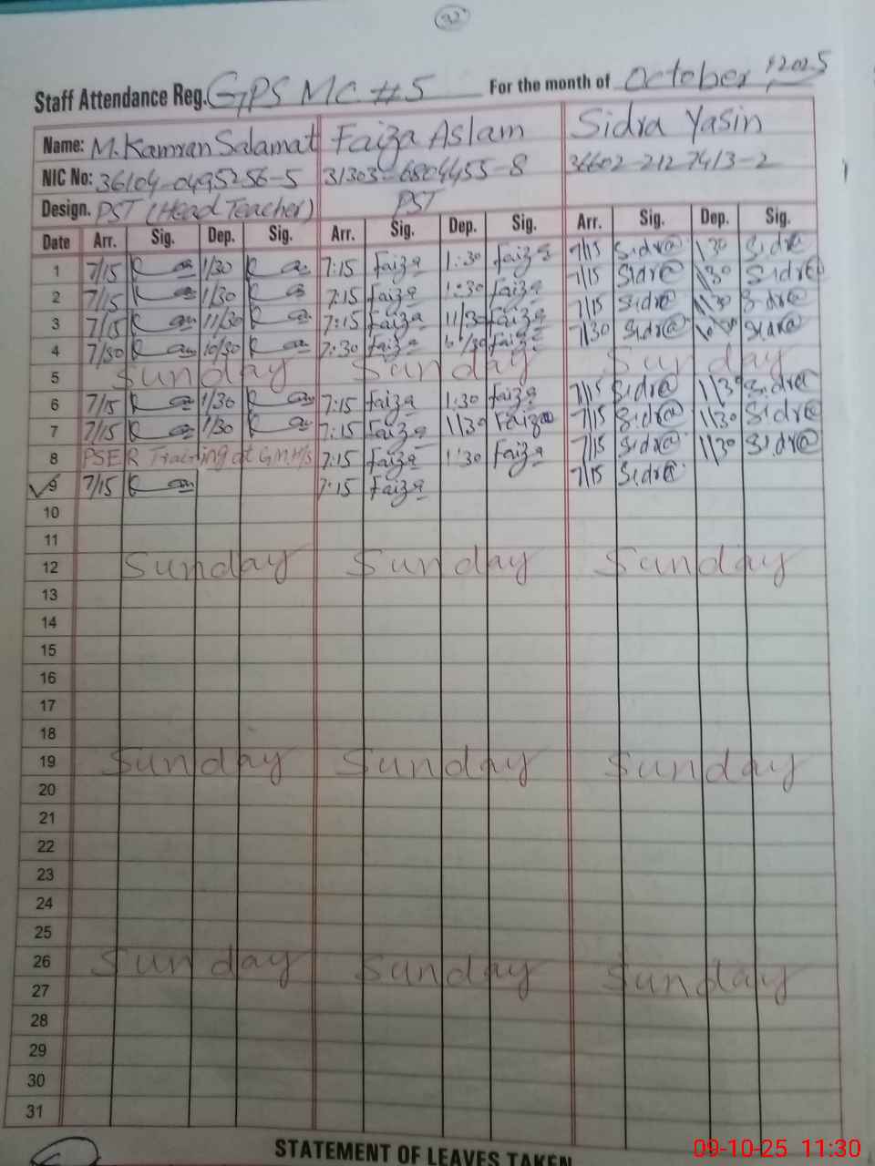 | CNIC | Full Name | Designation | R/C | Absence During Last Calender Month |