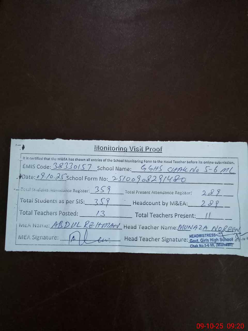 | Attendance Register | Head Teacher | MEA with School | Visit Proof |