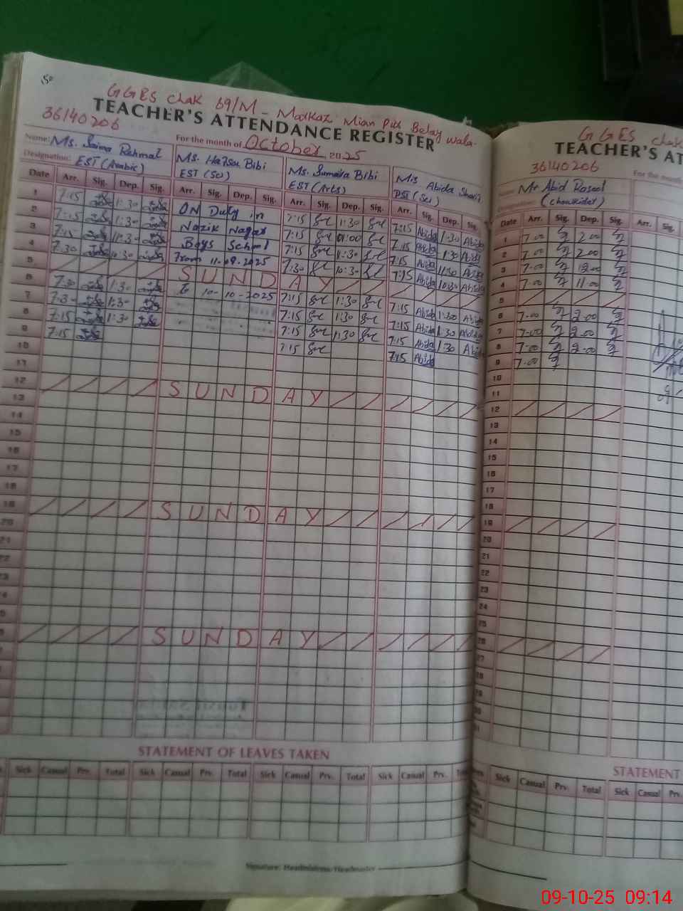 | Remarks (Use Separate Page if Required): EST Hifsa bibi marked on attendance register on temporary duty but no order available in school Marked unauthorized absent wef 11 September 2025 to onward | |||||