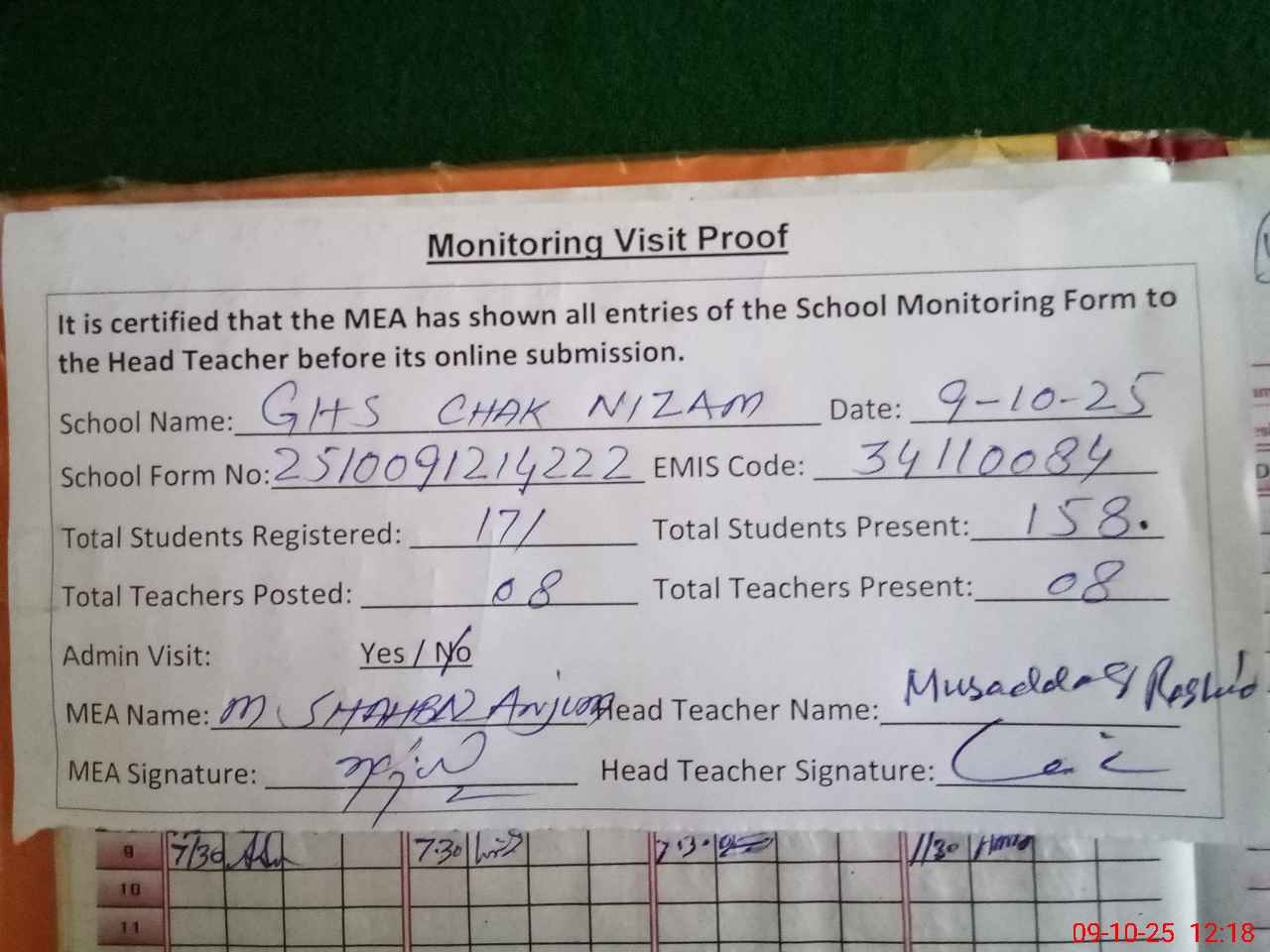 | Attendance Register | Head Teacher | MEA with School | Visit Proof |
