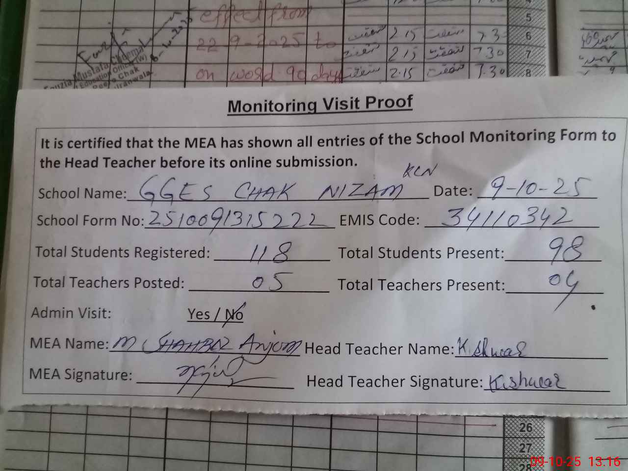 | Attendance Register | Head Teacher | MEA with School | Visit Proof |
