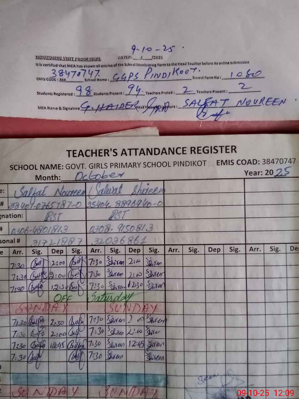 | Monitoring Date: 09-10-2025 | Start Time: 09-10-2025 11:37 AM | End Time: 09-10-2025 12:10 PM | Name of MEA: GH**** HA**** | |