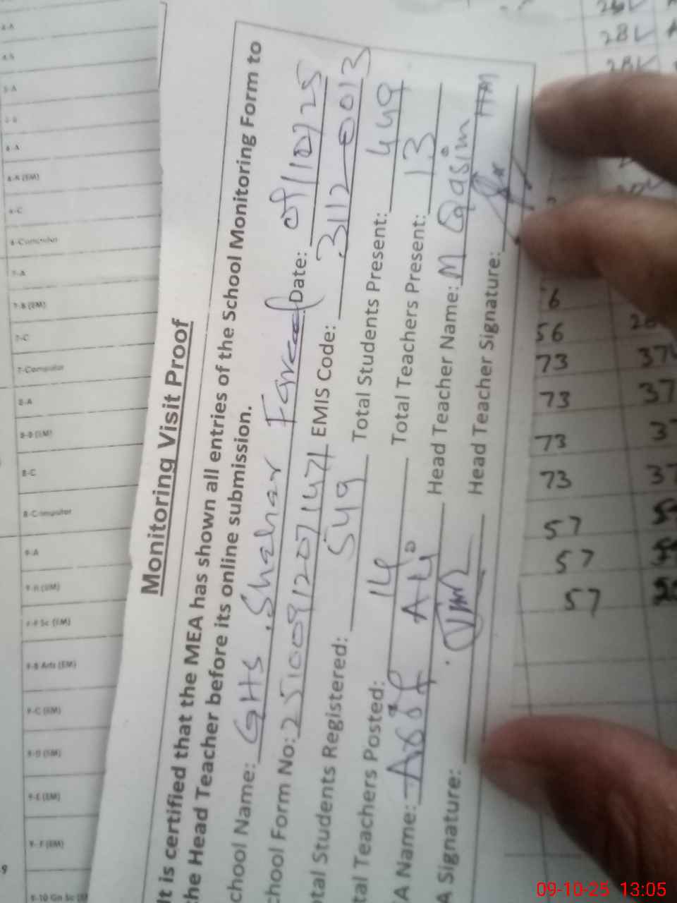 | Attendance Register | Head Teacher | MEA with School | Visit Proof |