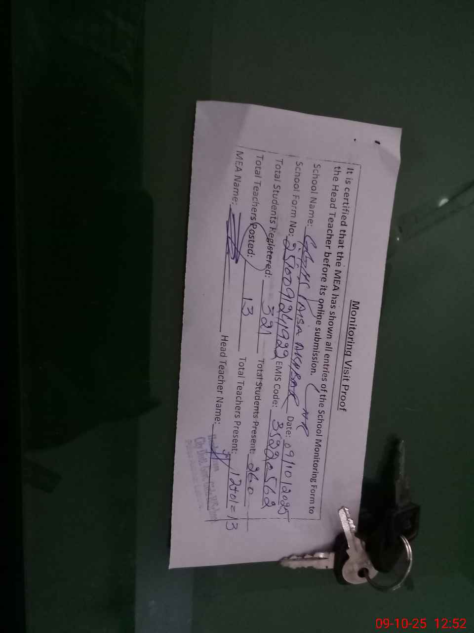 | Attendance Register | Head Teacher | MEA with School | Visit Proof |