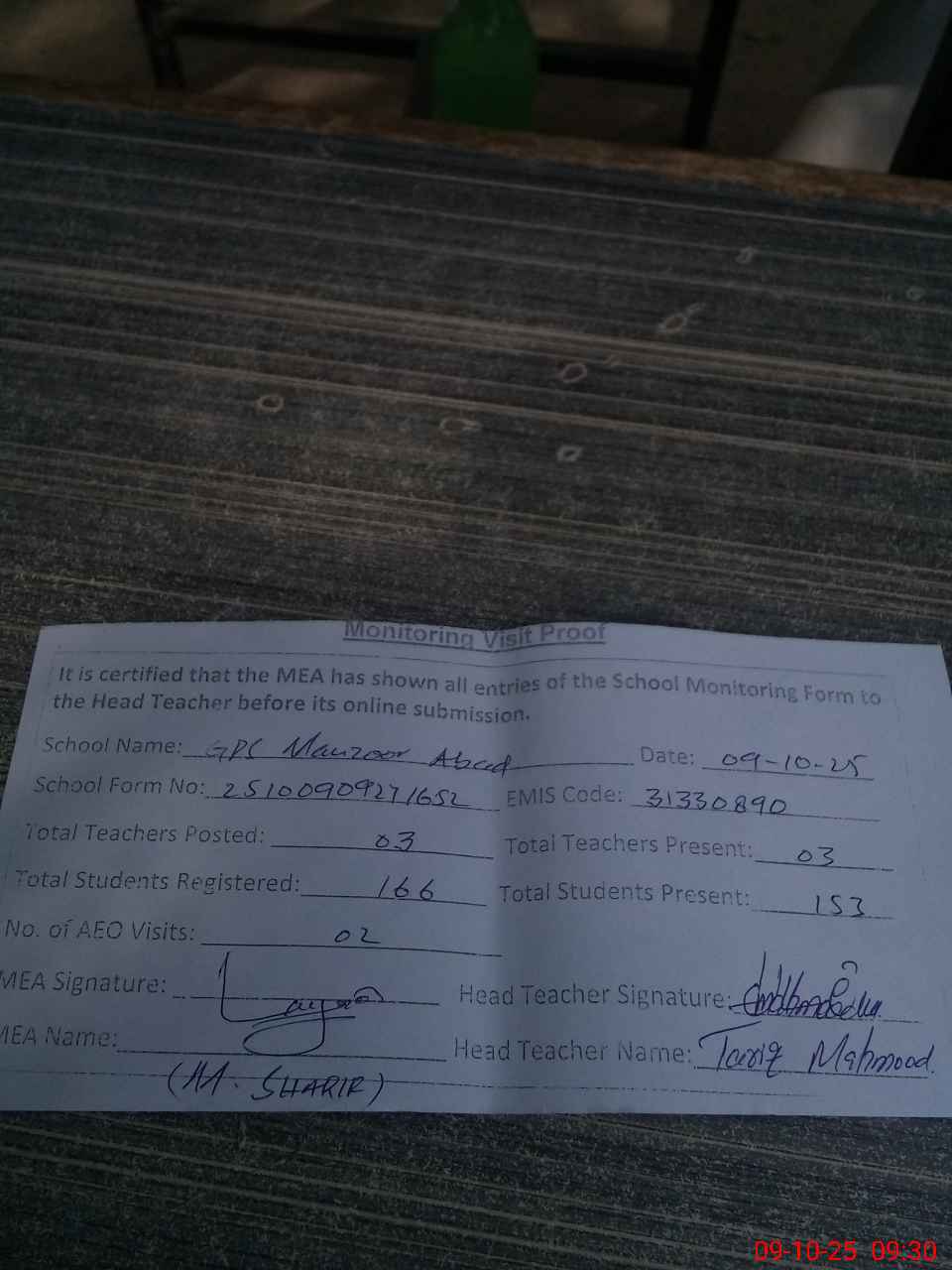 | Monitoring Date: 09-10-2025 | Start Time: 09-10-2025 09:05 AM | End Time: 09-10-2025 09:40 AM | Name of MEA: Mu**** Sh**** | |