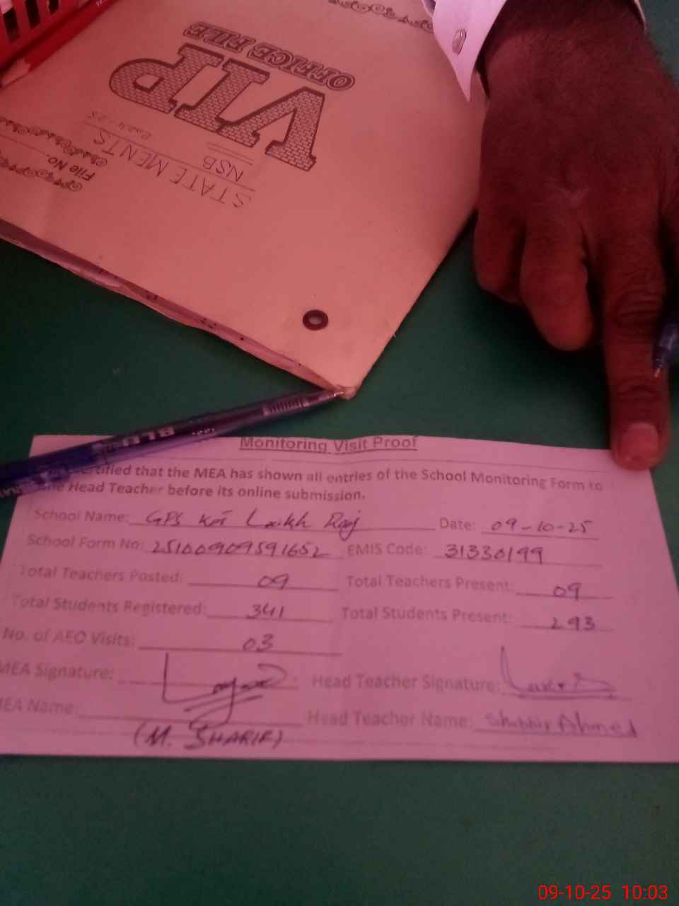| Attendance Register | Head Teacher | MEA with School | Visit Proof |