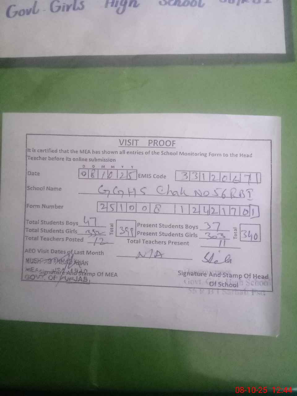 | Certified that this School was Inspected by the Undersigned MEA/DMO Today and the Information Stated Above is as Per Record. | |||||