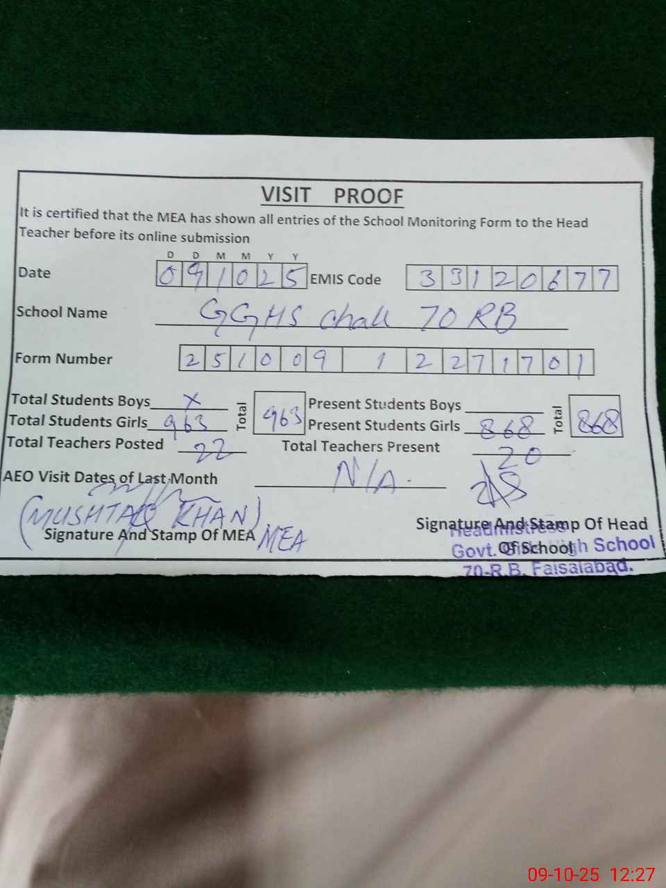 | Attendance Register | Head Teacher | MEA with School | Visit Proof |