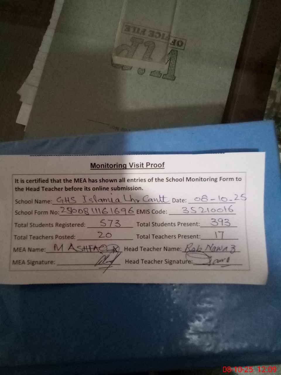 | EMIS Code: 35210016 | Name of School: GHS ISLAMIA LAHORE CANTT | |||