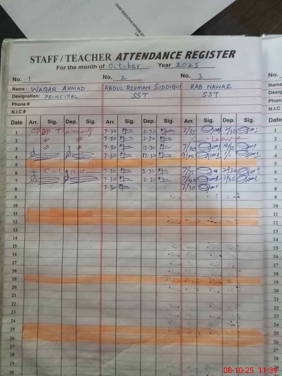 | Remarks (Use Separate Page if Required): Principal Waqar Ahmad Attendance blank in register so mark him absent today Council Meeting not conducted in the month of September 2025 SST Mahmood Khan retired from service since 21 February 2024 but his name still shown on SIS FTF register not updated after April 2025 35210016 | |||||
