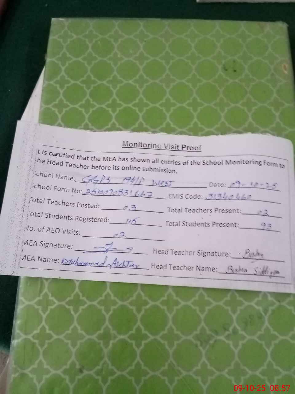 | Attendance Register | Head Teacher | MEA with School | Visit Proof |
