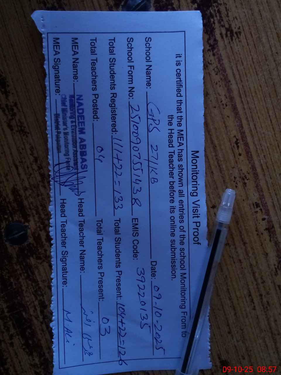 | Attendance Register | Head Teacher | MEA with School | Visit Proof |