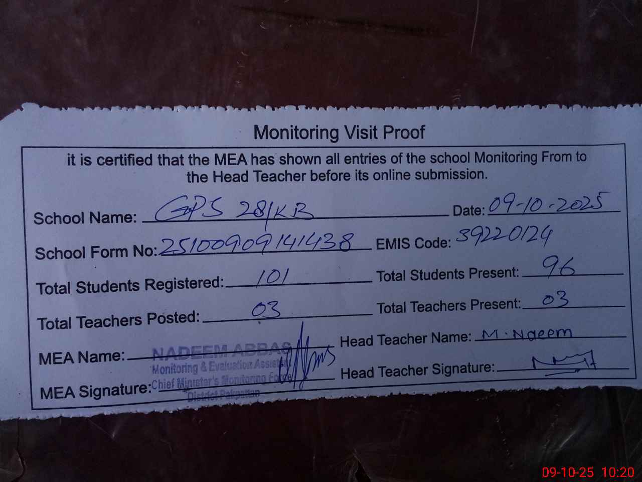 | Monitoring Date: 09-10-2025 | Start Time: 09-10-2025 09:14 AM | End Time: 09-10-2025 10:21 AM | Name of MEA: NA**** AB**** | |