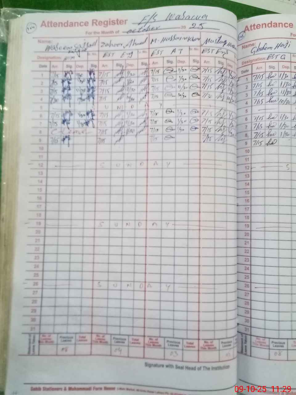 | CNIC | Full Name | Designation | R/C | Absence During Last Calender Month |