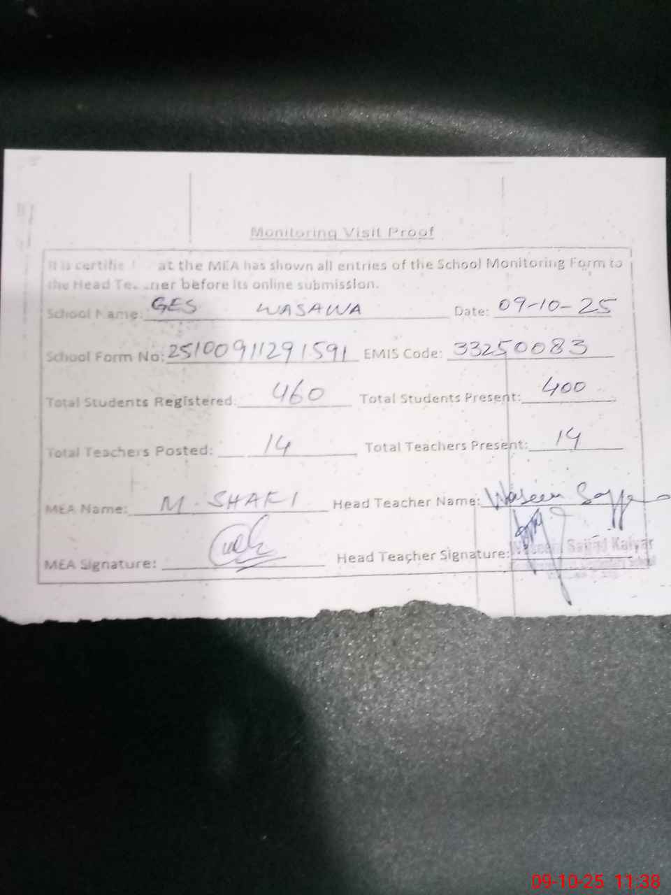 | Attendance Register | Head Teacher | MEA with School | Visit Proof |
